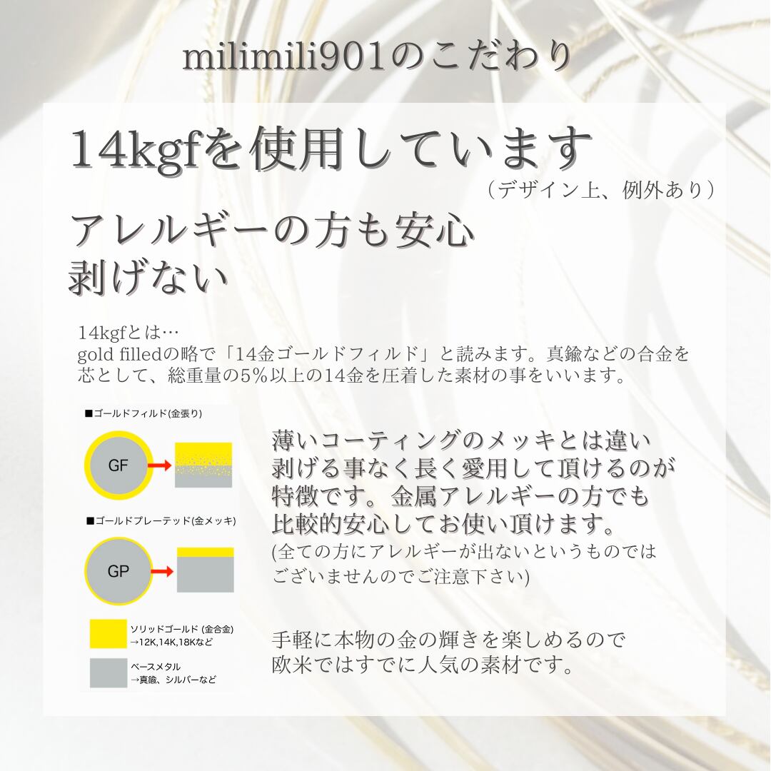 14金の重量が総重量の1/20以上で14金が圧着されている為、金属アレルギーの方でも比較的安心してお使い頂けます。(全ての方にアレルギーが出ないというものではございませんのでご注意下さい)