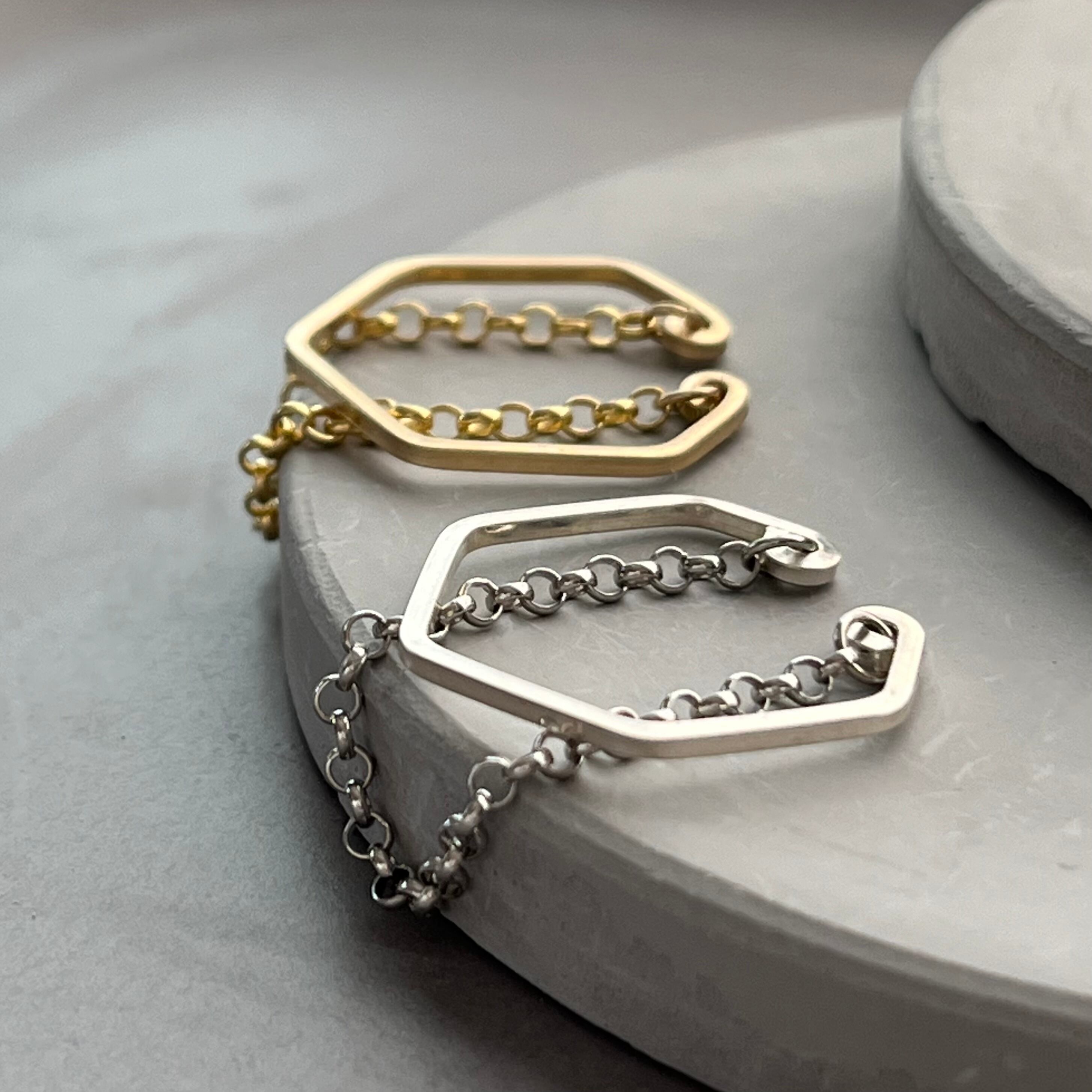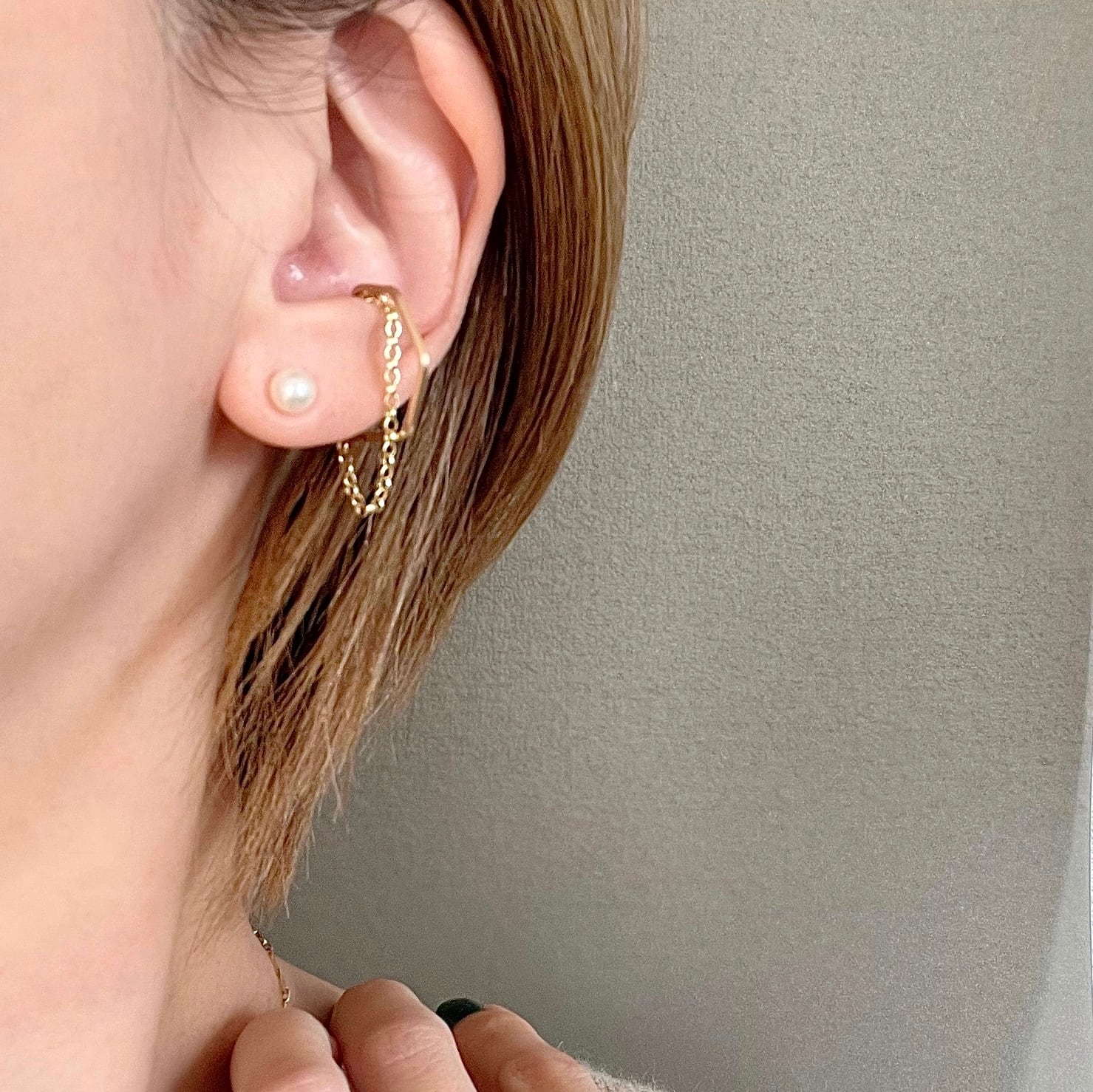 人気の定番商品スクエアワイヤーの六角形イヤーカフに、高級感があり綺麗な落ち感のロロチェーンを重ねました。一つで大人っぽいこなれ感が叶う優れもの。デイリーにもお出かけにも、又どんなファッションにも合うので一つあると重宝すること間違い無しです。