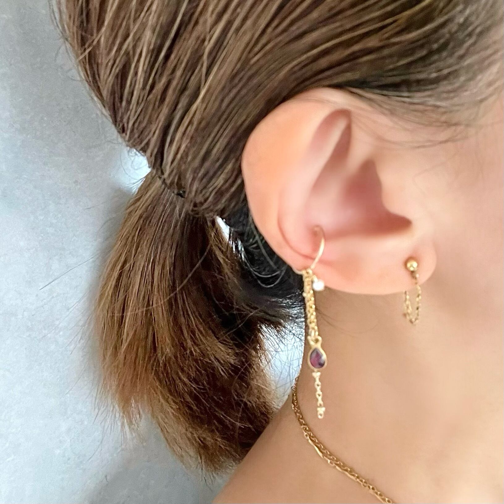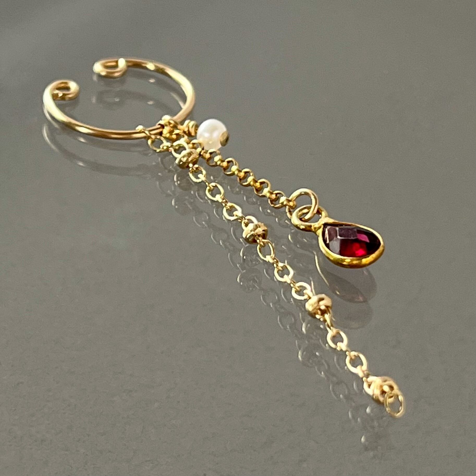 ロードライトガーネットはガーネットの1種で、赤と紫が混ざり合った印象的なきらめきが人気の宝石です。小さなパールと共に優しく揺れる様子がとてもフェミニンなイヤーカフです。
